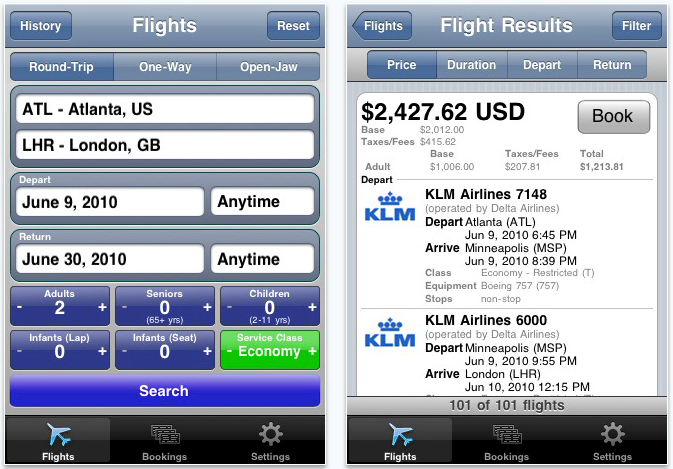 Search airfare from over 400 airlines worldwide to find the best deals on travel. You can book flights, select seat preferences, and apply your frequent flyer number from the app interface.